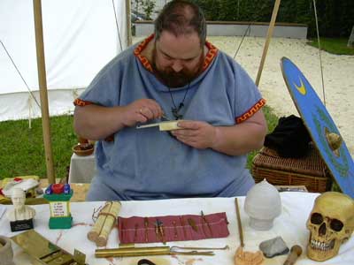 | "Antike Heilkunde" Als Medicus der COH IIII VIND zeige ich unter anderem die Replik eines Ärztebestecks, welches am Limeskastell Zugmantel gefunden wurde, sowie weitere Instrumente und Gerätschaften römischer Ärzte. Diese werden durch mich erklärt und ich gebe einen Eindruck der Denkweise in der antiken Heilkunde.