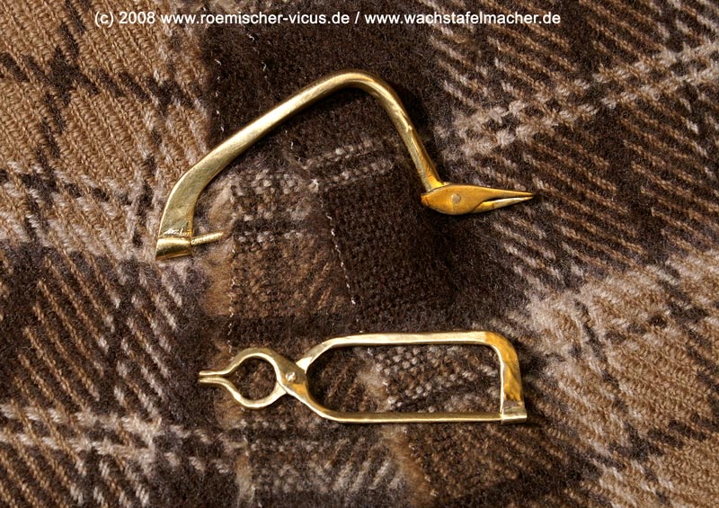 Zwei verschiedene römische Zangenfibel-Formen: Die obere ahmt eine Flachzange nach, während die untere die Form einer römischen Schmiedezange oder Tiegelzange hat.